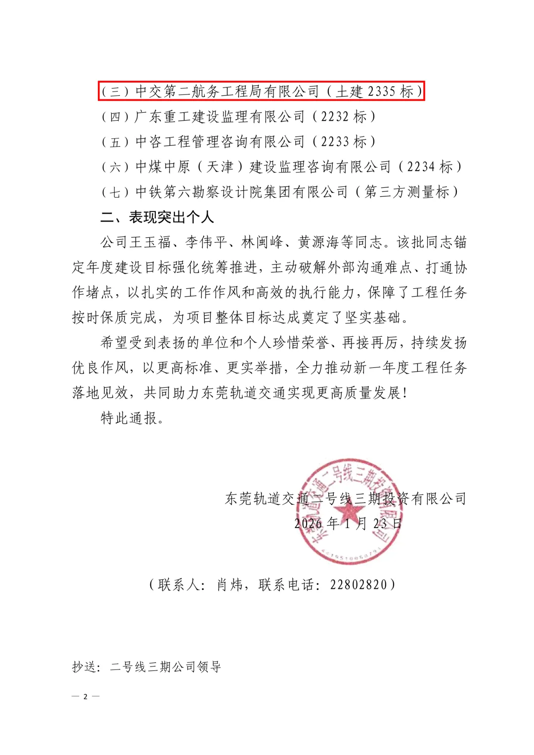 东莞地铁2号线项目在业主2025年度表彰中获评表现突出单位