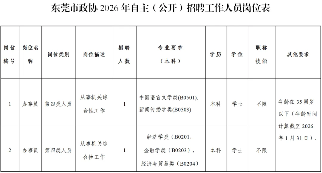 1.东莞市政协2026年自主(公开)招 聘工作人员岗位表
