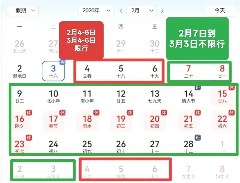 核心暂停限行时段:2026年2月9日(腊月二十二,周一)至3月3日(正月十五元宵节,周二)期间的所有工作日。