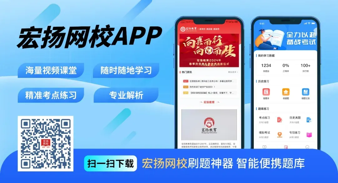 宏扬网校APP:智能题库+精准练习,配套专业解析,随时随地刷题提分,学习灵活又高效。