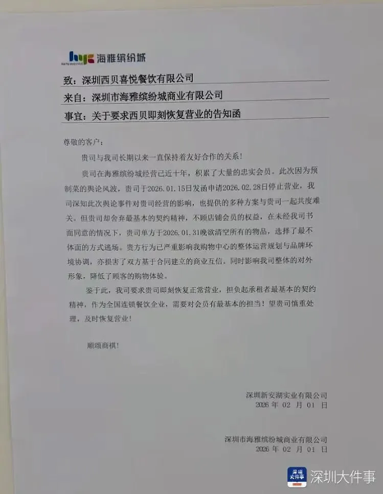2月2日,有网友在社交媒体上发布一则“西贝关店跑了,商场贴告知函催它回复营业”的消息。网帖公布深圳新安湖实业有限公司与深圳市海雅缤纷城商业有限公司共同署名的一份《关于要求西贝即刻恢复营业的告知函》显示,深圳西贝喜悦餐饮有限公司单方在2026年1月31日晚欲清空所有物品,“选择了以最不体面的方式逃场”。