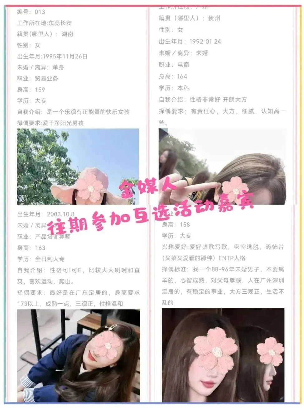 2、关于嘉宾资料真实性,我们只是形式审核基本资料,具体的好人、坏人、人品等需要你们自己多了解。建议保持警惕,多接触了解,不要急于付出,不要有金钱往来,交友有风险,后果需自负。