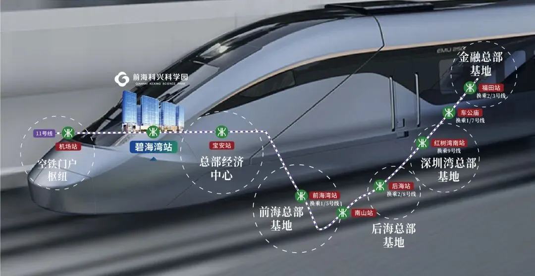#前海科兴科学园是正中集团打造的“世界湾区总部新集群”,定位为甲级写字楼综合体。项目位于宝安西乡与前海扩容区交汇带,总建筑面积约18.6万㎡,由9栋办公塔楼及商业裙楼组成。作为地铁11号线碧海湾站上盖物业(距A口仅400米),项目以180°山海景观、垂直绿化生态和24小时冰蓄冷空调系统为核心亮点,聚焦科技研发、金融等企业总部,承接前海自贸区与大空港经济圈双重红利。