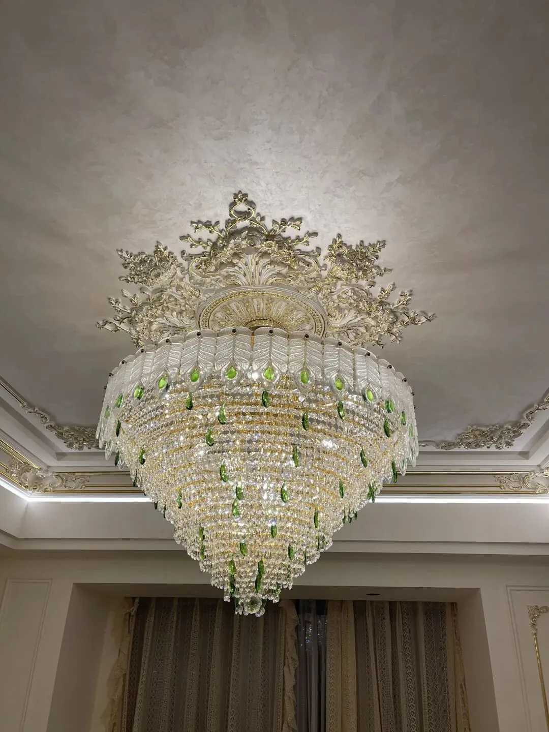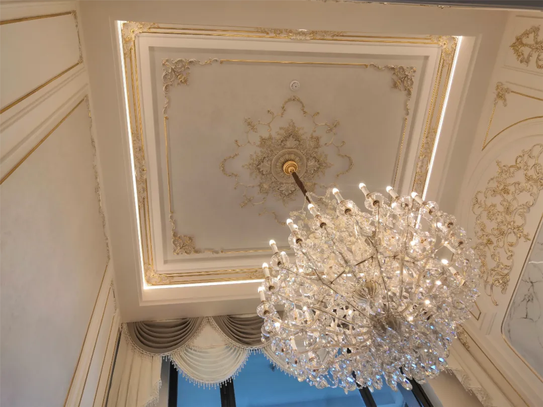 踏入这栋欧式复式豪宅的挑高客厅时,连脚步都不自觉放轻 —— 不是怕惊扰了什么,是被天花与墙面漫开的柔润光泽绊住了视线。这是奥斯罗深圳宝安服务中心的手笔:用奥斯罗 OUXLU 贵族系列的核心产品 “斯达丝绸艺术涂料”,把 200 多平的复式空间,裹进了一层似雾似缎的奢华肌理里。鎏金雕花沿着天花的丝绸纹理蜿蜒,水晶吊灯的光落下来,竟像浸在了柔滑的丝缎里,连硬朗的欧式线条都软了几分。这不是一场简单的装修,是把十七世纪欧式贵族宅邸的柔润质感,妥帖安放在了当代深圳的复式空间里。