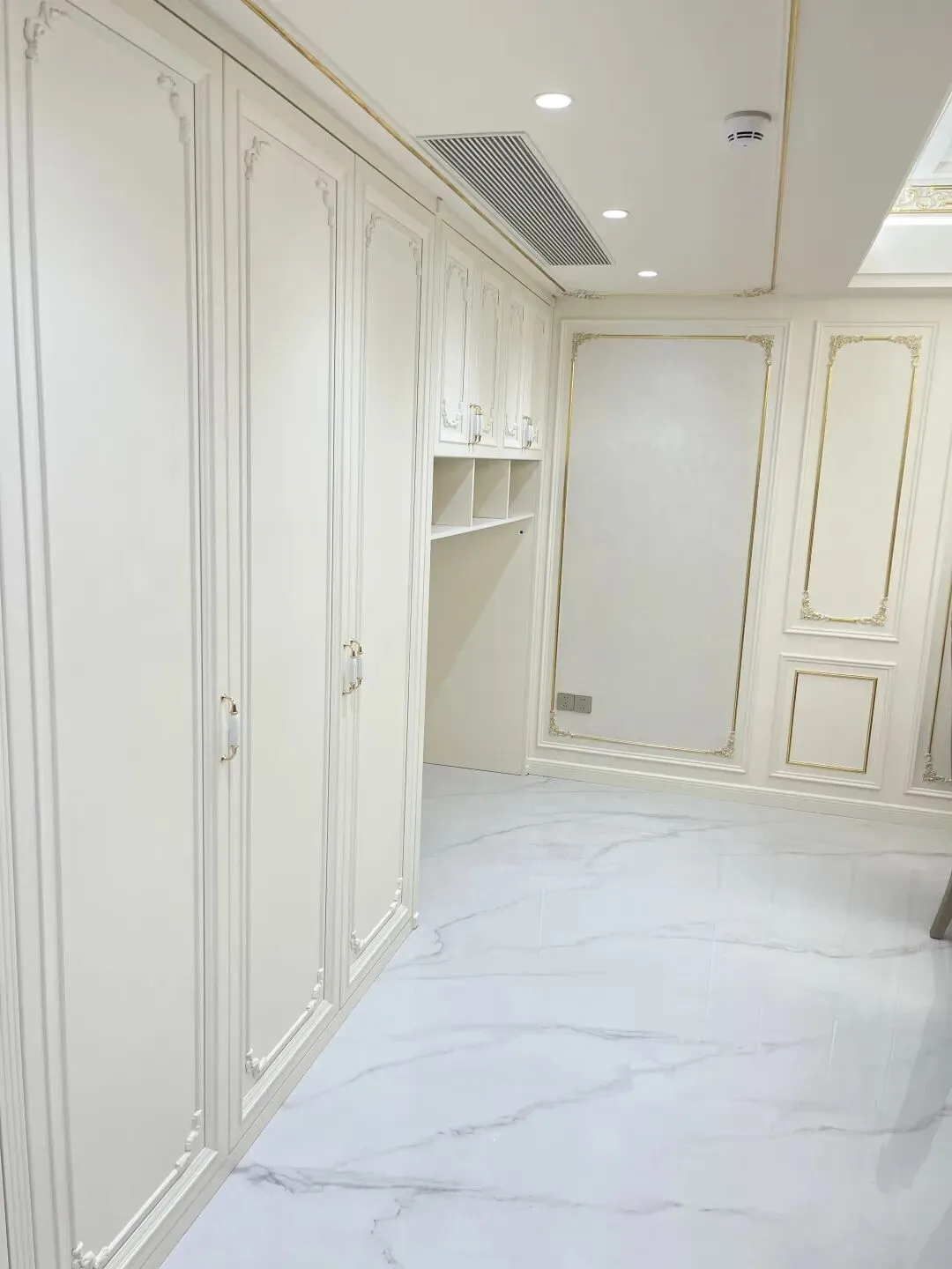 拾级而上的主卧是另一番温柔景致。斯达丝绸涂料在床头背景墙织就了暗纹花型,浅香槟色的肌理在床头吊灯的暖光里,像被阳光晒软的丝绸锦缎。定制的雕花床头与墙面的鎏金饰条无缝衔接,连衣帽间的柜门都用同色系涂料做了哑光处理 —— 推开柜门时,整面墙的丝绸质感与鎏金线条,把收纳空间也变成了艺术品。最动人的是那些看不见的用心:奥斯罗深圳宝安服务中心的工匠们,用斯达丝绸艺术涂料的延展性,把复式结构里的梁柱、阴阳角都处理得浑然一体,没有拼接的生硬,只有丝绸般的顺滑从天花垂落地面。
