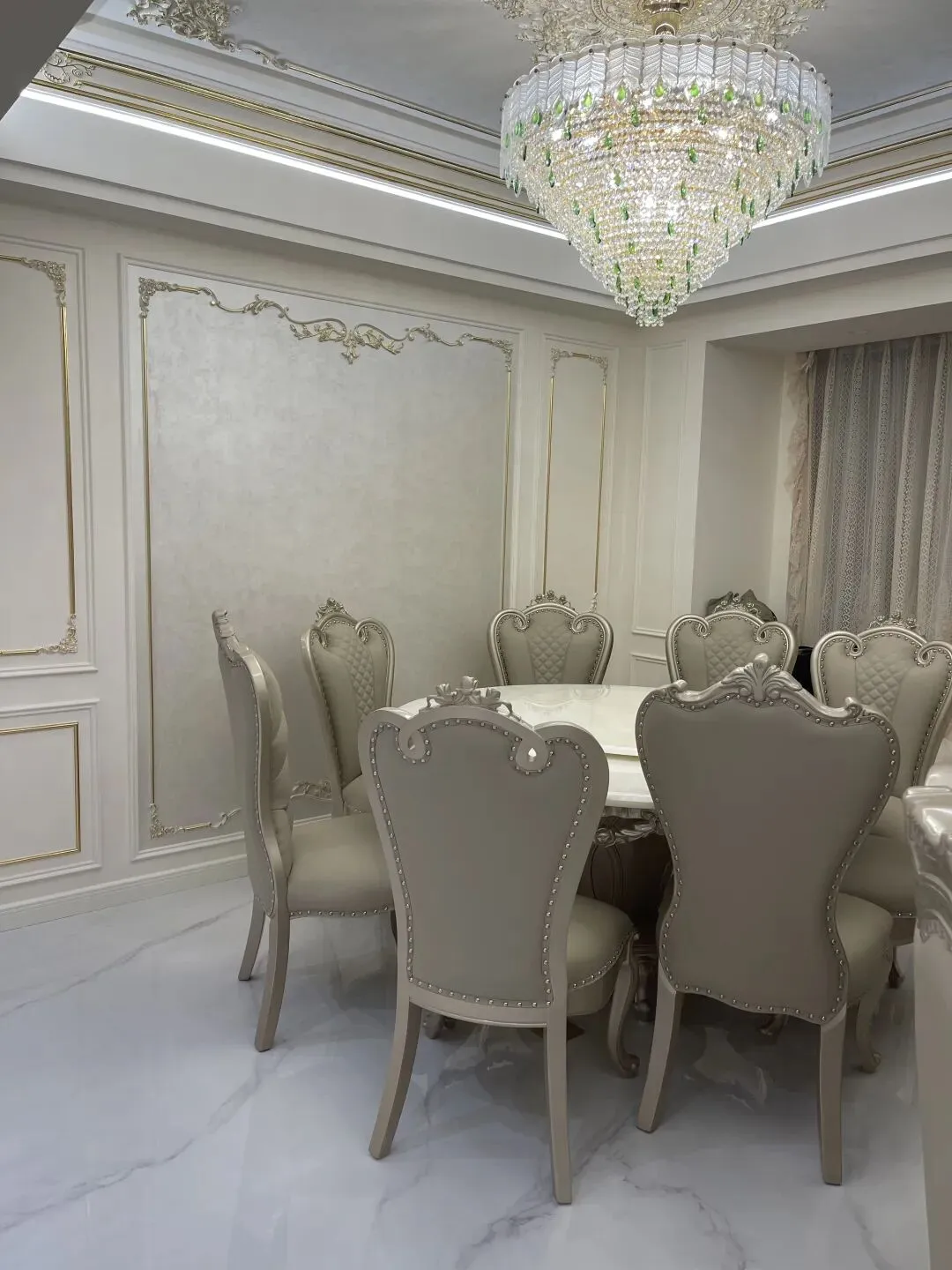 转至餐区,十二人位的雕花餐椅围拢着大理石餐桌,墙面的斯达丝绸涂料以米白为底,金色饰线框出复古的对称构图,连风口的边缘都做了鎏金收边。傍晚开餐时,嵌着绿调晶石的水晶吊灯在丝绸墙面上投下细碎的光斑,每一道菜的热气里,都裹着欧式晚宴的仪式感。奥斯罗的工匠特意用斯达丝绸涂料的柔缎微光质感,平衡了水晶灯的璀璨,让奢华不至于刺眼,只留下温柔的包裹感。