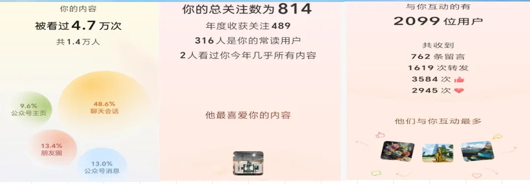 共鸣之声:从知音难觅到同行者众“酒逢知己饮,诗向会人吟。”2024年,黄金星曾在《笔尖下的呼唤:寻觅那些共鸣的心灵》中袒露心声,渴望得到商会同仁、同窗挚友与邻里乡亲的认可。这份期盼在2025年迎来了热烈回响——全年4.7万次阅读、1.4万读者的关注,让他的文字跨越了公众号主页、聊天会话、朋友圈与公众号消息等多个传播场景,抵达了每一个渴望共鸣的心灵。
