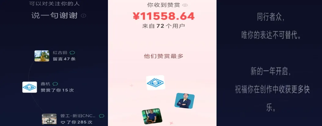 年度阅读量最高的《笔尖下的呼唤:寻觅那些共鸣的心灵》,恰是这份共鸣的最佳注脚。文章中,他真挚呼唤广东福建龙岩商会、东莞市福建商会、常平珠宝园区业主等社群的“会人”,希望用文字搭建连接心灵的桥梁。而现实给出了最温暖的回应:东莞市福建商会常平分会秘书长黄鸿儒的切心留言、会长陈东阳“洞察力超出我的认知”的盛赞,广东省福建龙岩商会卢明开主任“文言顺畅,妙笔生辉”的评价,以及副会长戴利荣持续的点赞与在看,让他真切感受到“懂者自懂”的欣慰。更令人动容的是那些一路相伴的“铁杆读者”。曾烘钦,这位看过他2025年几乎所有内容的忠实粉丝,用无声的陪伴诠释了对文字的热爱;红古田官贵阳以47条留言成为年度留言最多的用户,每一条评论都饱含对文章的深度思考;鑫杭公司李荣不仅成为文章主角,更以15次赞赏成为年度赞赏最多的用户之一,用实际行动支持着这份文字事业。全年762条留言、1619次转发、3584次在看、2945次点赞,以及11558.64元来自72位用户的赞赏,这些数字背后,是2099位互动用户与黄金星的心灵对话,是文字跨越地域、身份的力量。
