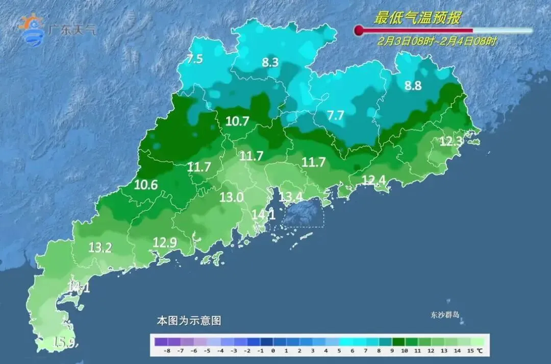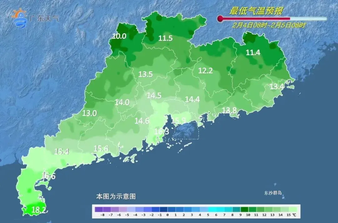 2月4日,中西部市县多云间阴天,早晚有轻雾或雾,其余市县晴到多云。最低气温:粤北、珠三角北部市县6~10℃,南部沿海市县15~19℃,其余市县10~15℃。