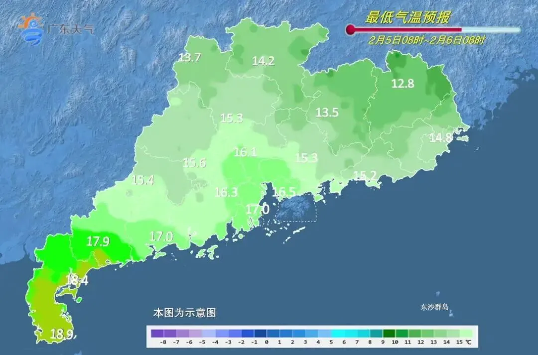 2月5日,西部市县多云到阴天,局部有小雨,其余市县晴到多云,全省大部早晚有轻雾或雾。最低气温:粤北、粤东北部市县10~14℃,粤西沿海市县17~20℃,其余市县14~17℃。