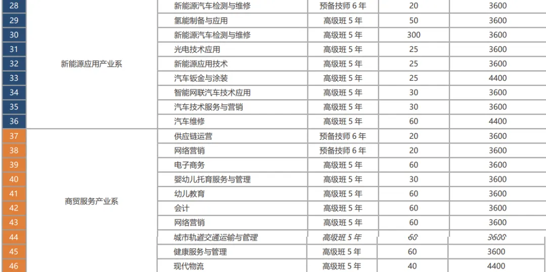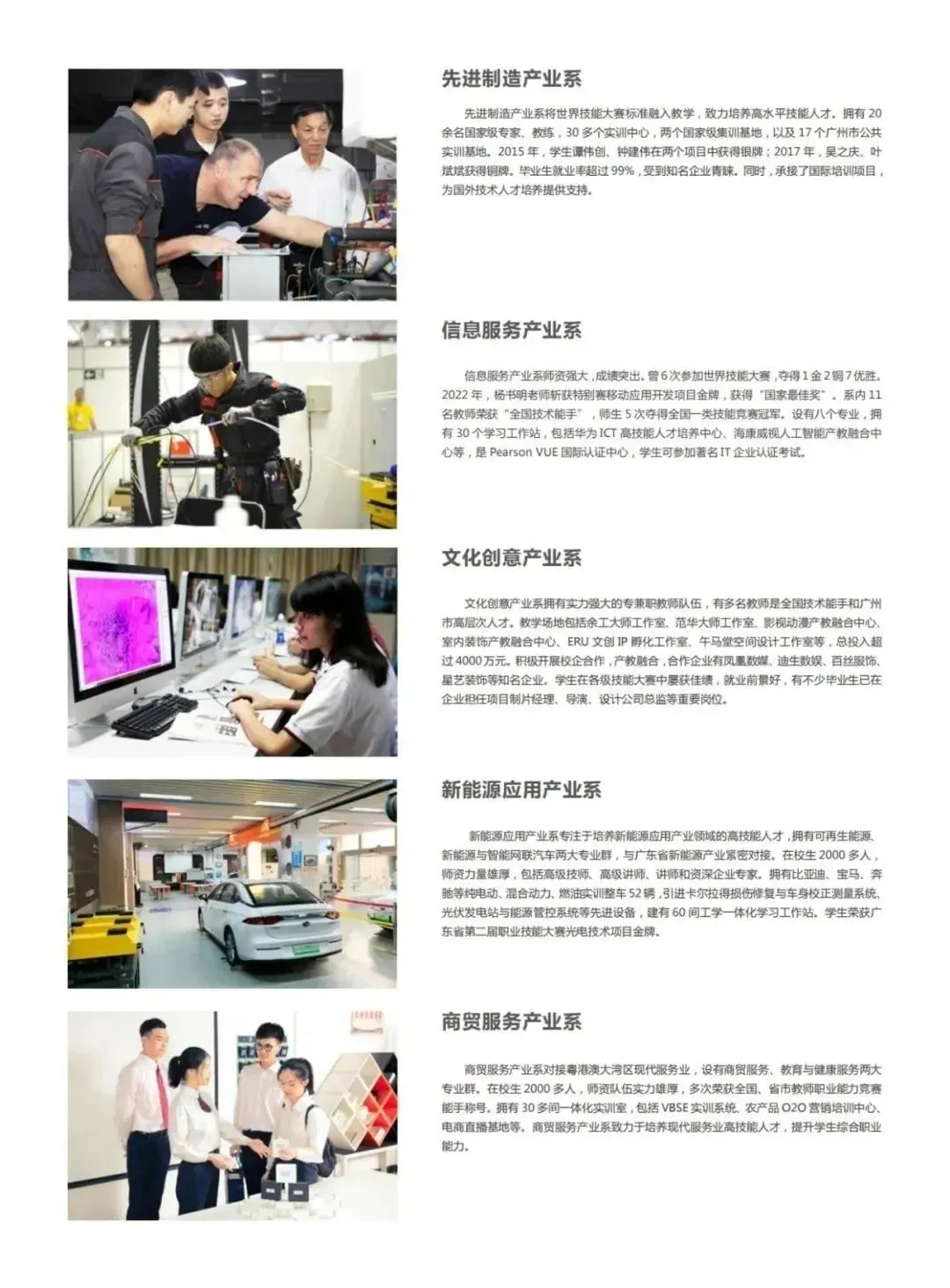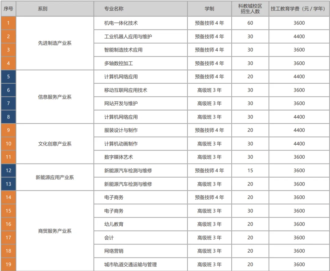设5大产业系(先进制造、信息服务、新能源应用、文化创意、商贸服务),36个专业,其中 8个省级特色专业(如工业机器人、新能源汽车检测与维修等)。
