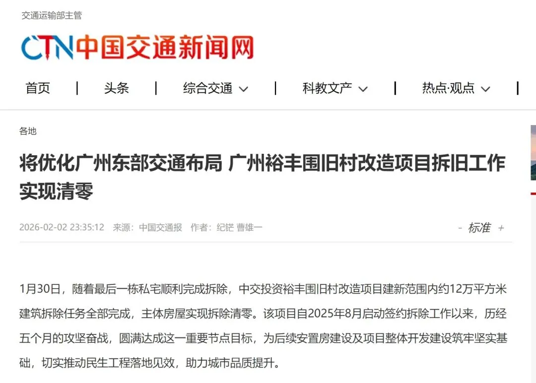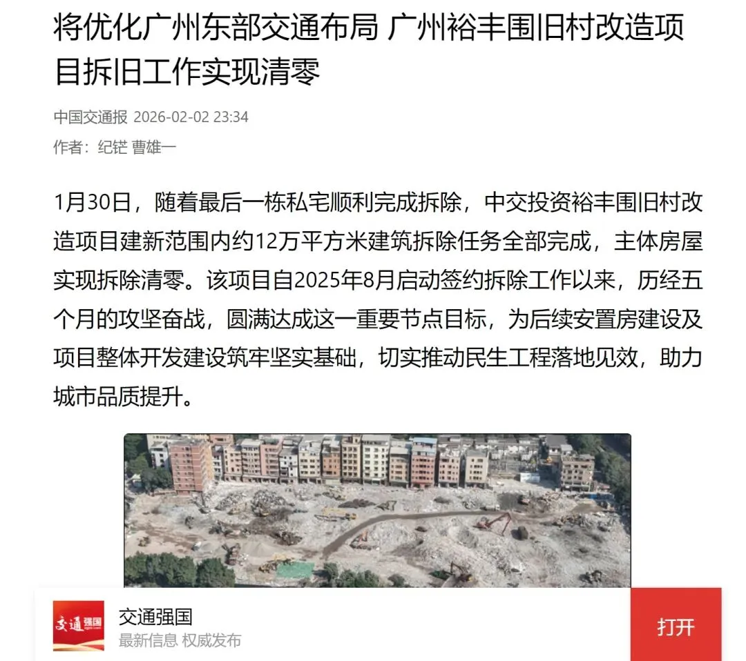 近日,中交投资裕丰围旧村改造项目拆旧工作实现清零,受到中国交通报的关注报道。