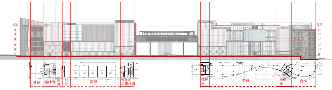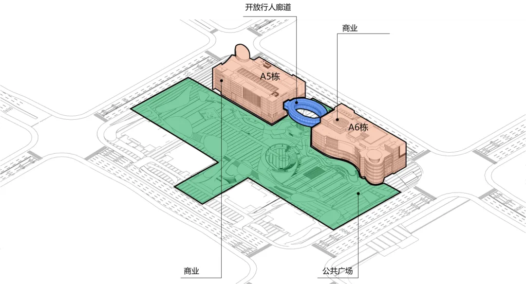 在四至五层间增设环形空中连廊,将A5、A6栋商业空间有机衔接,形成回流动线,提升商业效率与体验连续性。