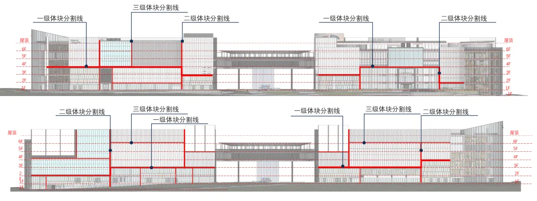 立面体块经打散与重组,呼应不同功能区域:在中庭、主入口等核心位置,采用大面玻璃幕墙,最大限度引入城市景观与自然光线。