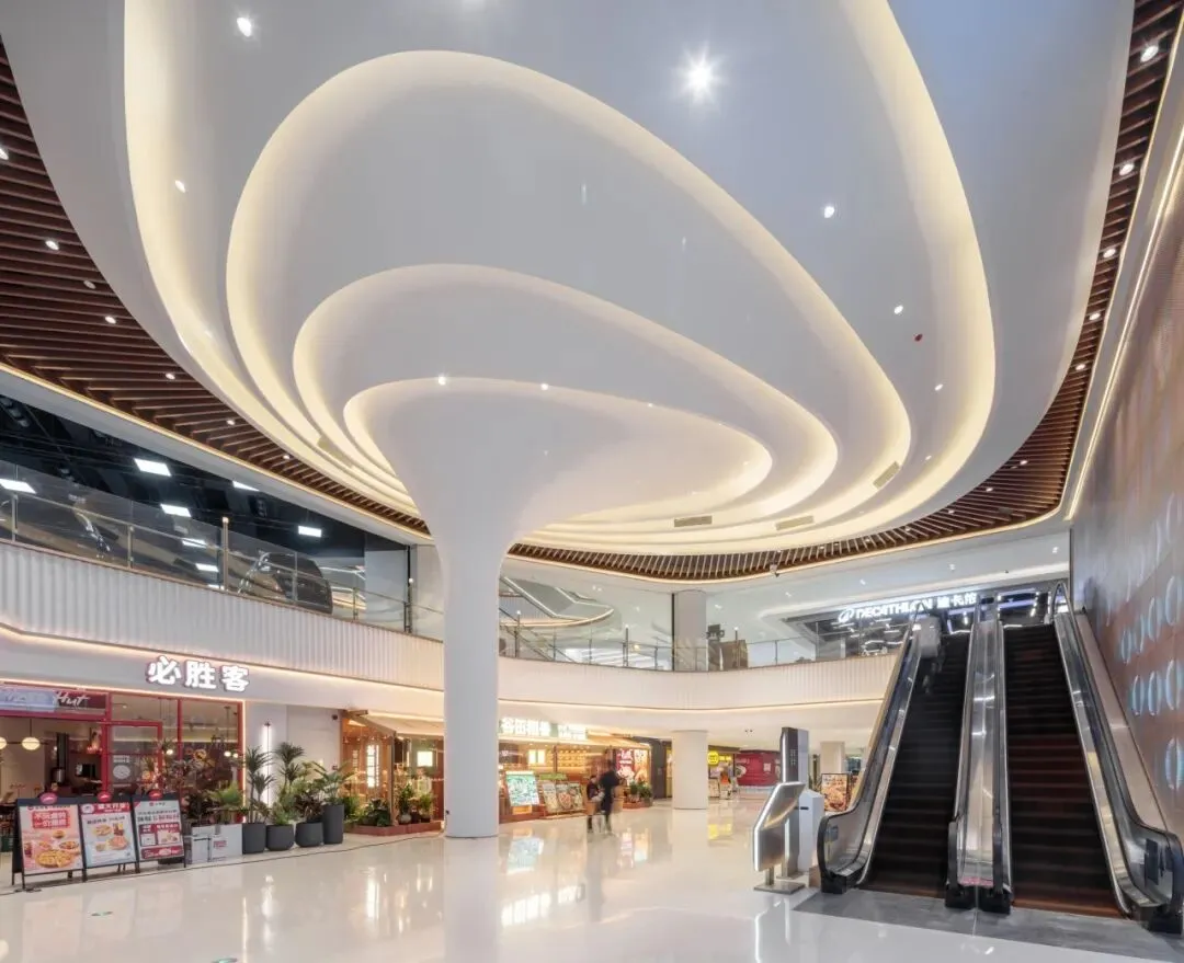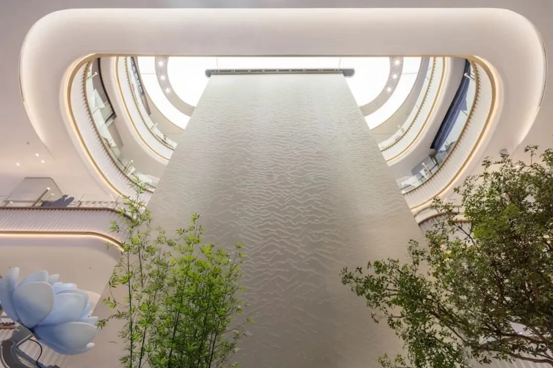 中庭采用涟漪形态的天花设计,是对水幕中庭的延伸,将空调出风口巧妙隐藏于内侧,兼顾设备遮蔽与结构空间的美化作用。