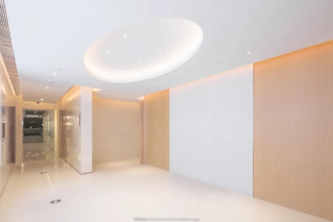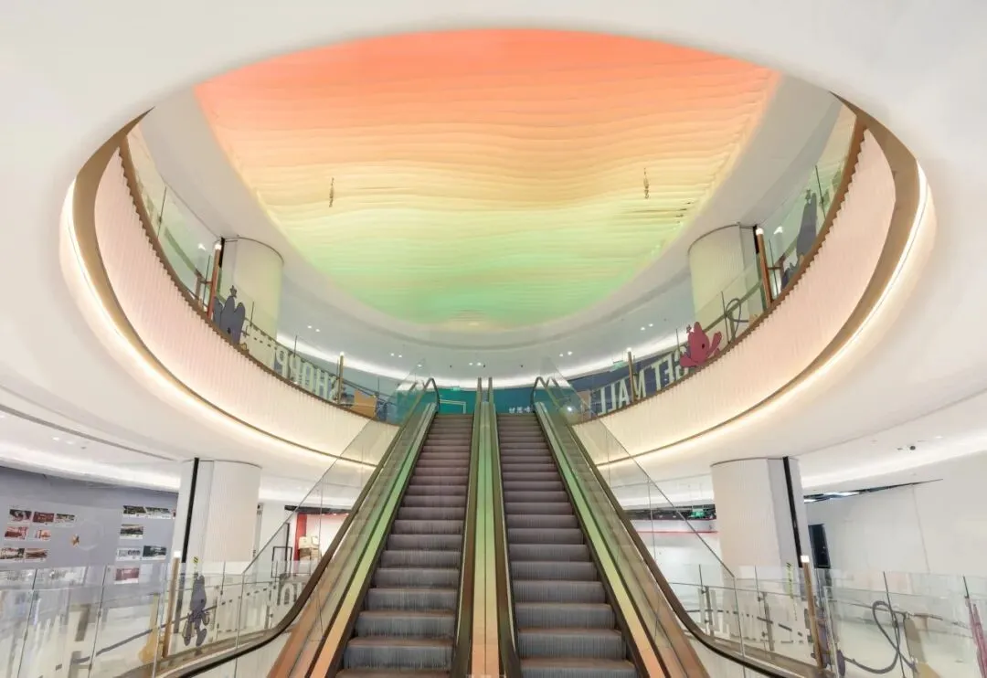 在扶梯厅、电梯间等过渡区域,采用跳色或个性风格处理,打破单调。A6栋扶梯中庭的天花以多片裁切拼叠的纹理纸,构成层叠起伏的波浪形态,将自然意象凝练于空间之中。