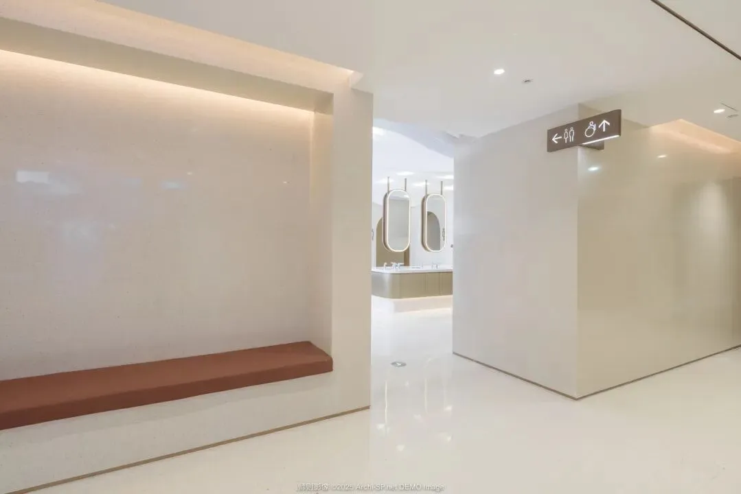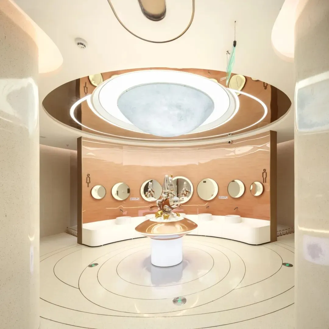 其中A6二层的卫生间就以“太空漫游”与“月食”为核心灵感设计的儿童主题卫生间空间;A5四层特色卫生间则延续了扶梯中庭天花的手法,A5四层卫生间则延续中庭的波浪语言,通过整体天花设计衔接动线视觉,营造柔和氛围。