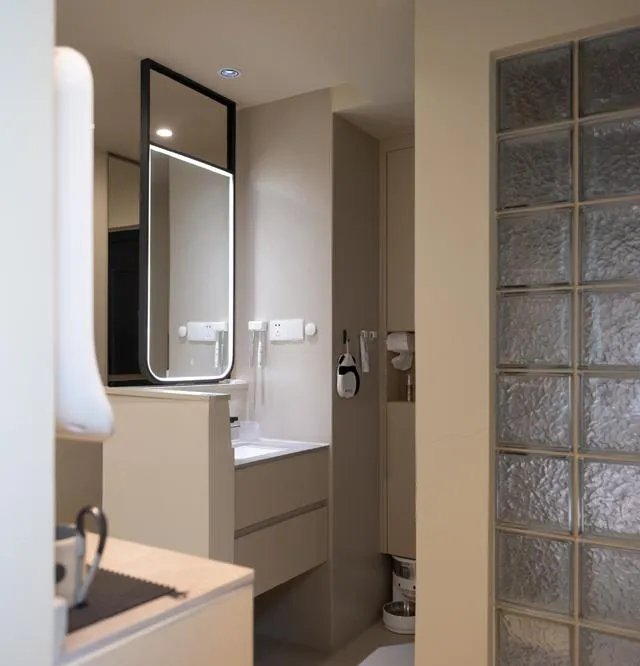 再往里走,卫生间的干湿分离设计真让我刮目相看。玻璃砖隔墙配上长虹玻璃推拉门,采光透亮,一扫小空间的压抑。外置洗漱区和半墙分隔,不光提升了空间感,还特别有设计感,洗面镜加上LED灯条,氛围满满,早晚洗漱都心情舒畅。