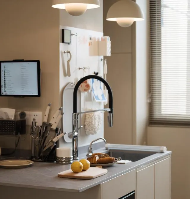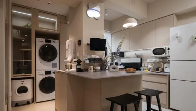 厨房、餐厅、家政、猫房合一的开放岛台设计,真的不能再妙了。承重柱做成“中岛”,围合感强,又方便动线,小小空间被榨干价值。岛台上放着早餐、咖啡机,还有优雅的小花束,看着就想多待一会。台面一侧的珐琅板实用又好擦,刀具餐具规整地挂着,啥都顺手。