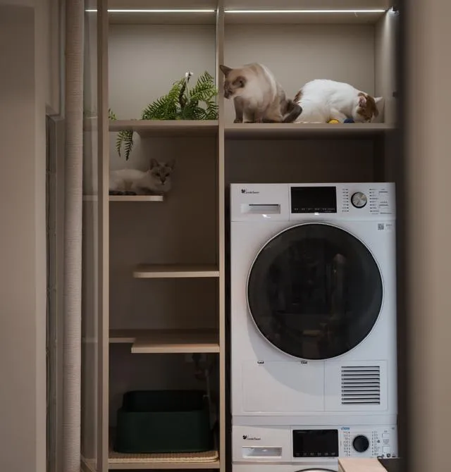 四只猫咪在家活得那叫自在。特别给它们留的猫房和爬架,和洗衣烘干机组合在一起。猫砂盆藏在柜子里,美观又无味,猫主子们跳上跳下自得其乐。这种和宠物和谐共处的细节,不经意间就戳中了软肋——家的幸福,其实也在这些和小动物共享的瞬间。