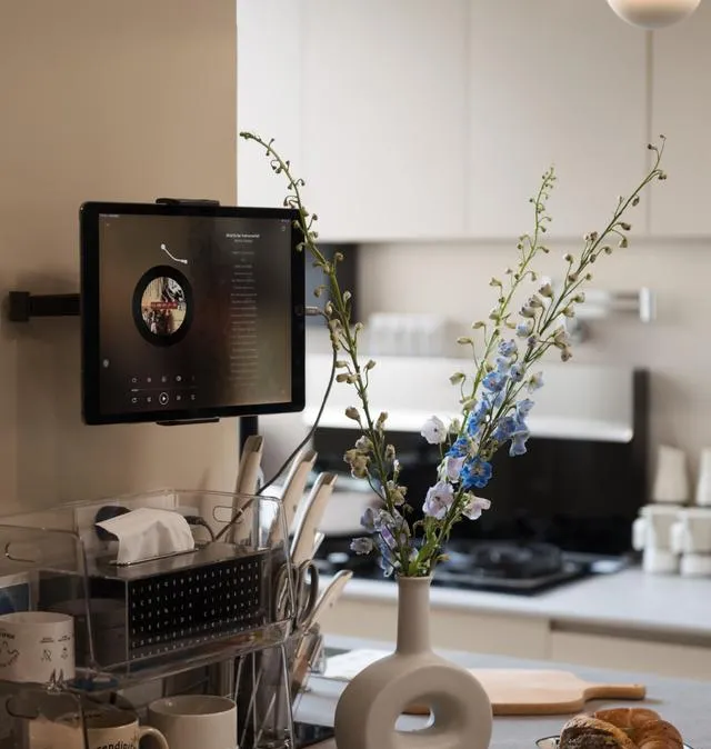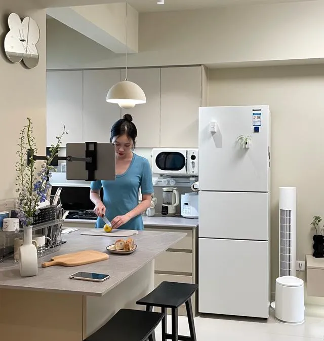 墙上的可旋转iPad支架,做饭时查菜谱、吃饭听歌,生活仪式感直接拉满!再说厨房旁那台和橱柜同色调的冰箱,悄无声息地融进这份温柔里。洗洗切切、收纳清洁,一气呵成,做饭都觉得心里亮堂堂。