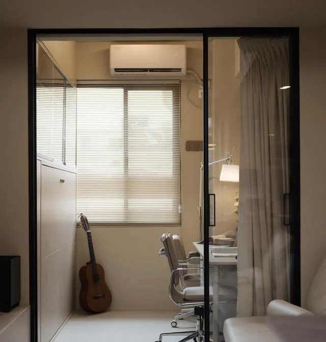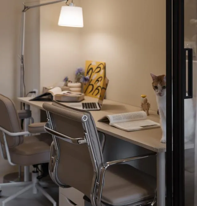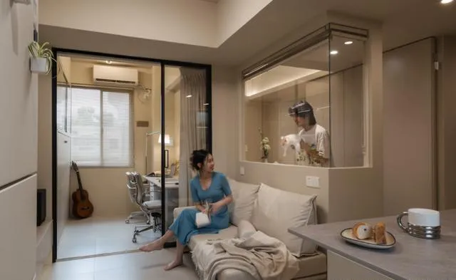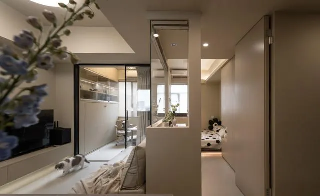 沙发靠着主卧玻璃隔断,空间既通透又互动。男主人和小猫咪在里头逗乐,女主人坐沙发聊两句日常,家里哪怕只有36㎡,幸福感一点都不少。书房是次卧变身,有隐藏墨菲床,可办公也能待客。靠墙的双人工作台,既实用又温馨,阳光透过玻璃就能让一天的疲惫都融化。