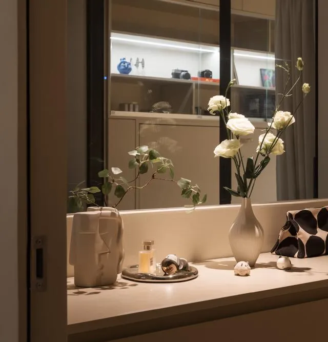 主卧不放高床,床垫铺在地台上,下面满是抽屉,收纳爆棚。玻璃窗下摆着1.6米斗柜,台面插花、精致小物,每一件都透出主人的用心。晚上陪着小猫咪在卧室撒欢,那种安稳的感觉,真的值千金。
