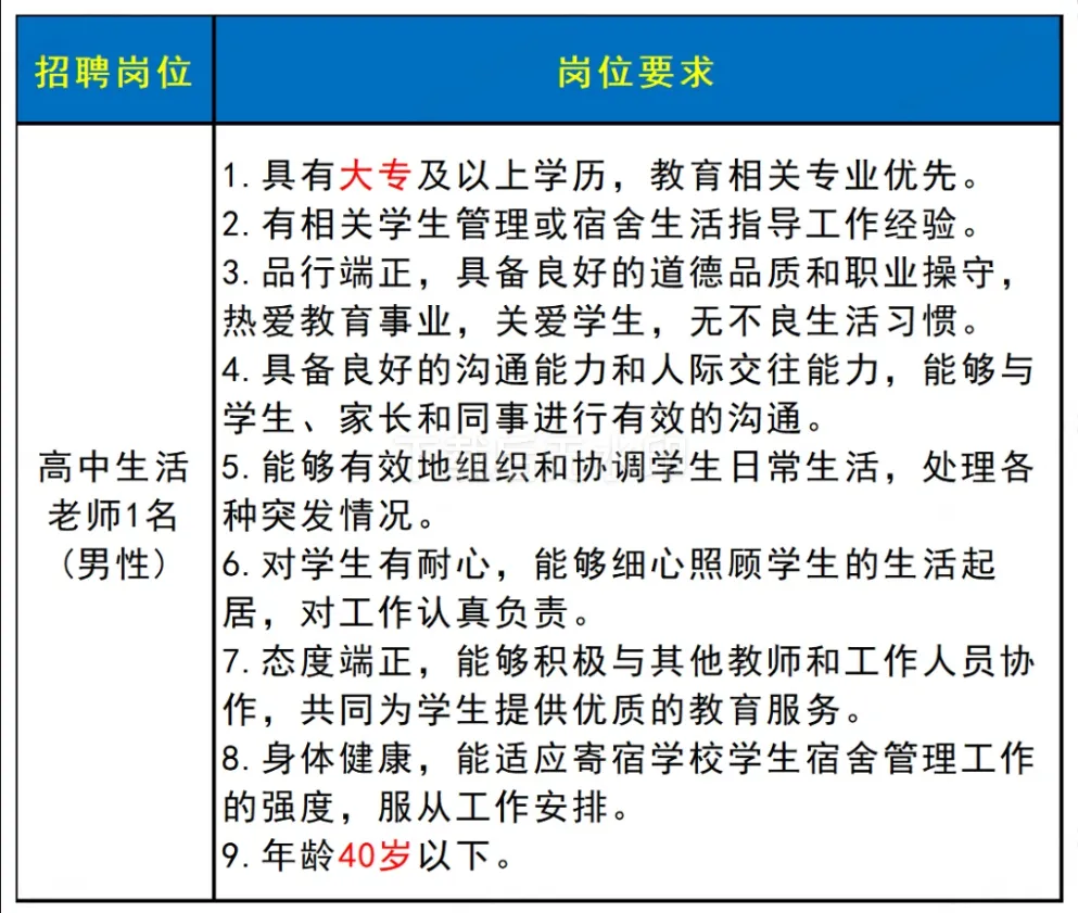 ✅招聘岗位:高中生活老师1名(男性),具体要求如下图所示