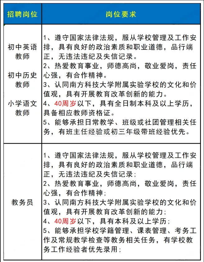 南方科技大学附属实验学校招聘