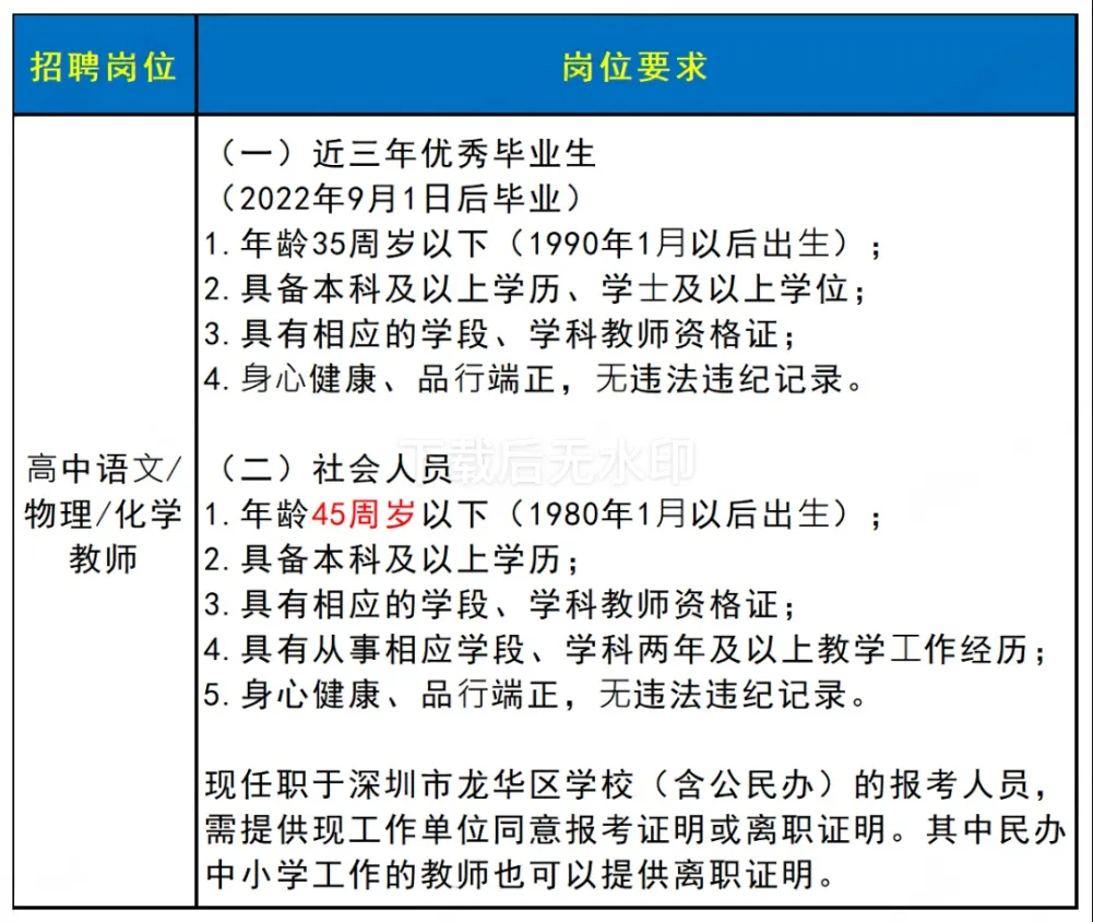 招聘⾼中语⽂教师1⼈、⾼中物理教师1⼈、⾼中化学教师1⼈,具体要求如下图所示