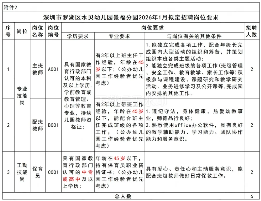 ✅招聘岗位:主班教师、配班教师、保育员,各2人,一共6人,具体要求如下图所示