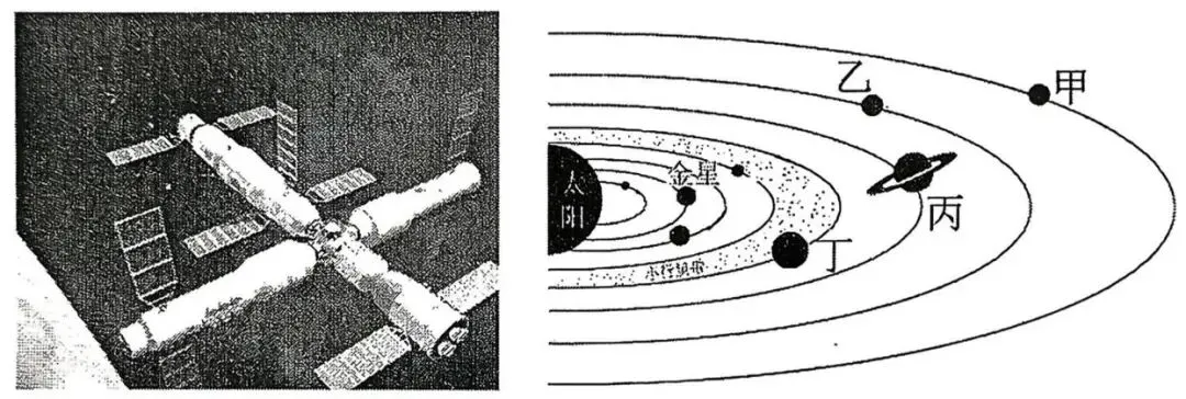 2025年10月31日23时44分,载神舟二十一号载人飞船的长征运载火箭在酒泉发射中心成功发射。10分钟后载人飞船与空间站顺利对接。下图为我国空间站与太阳系主要天体示意图。据此完成下面小题。
