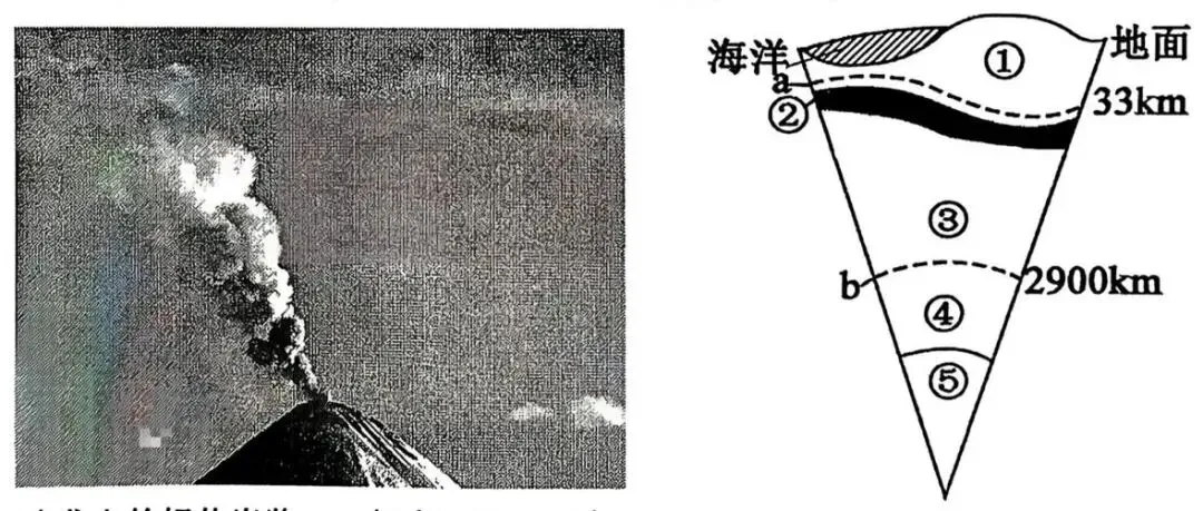 2025年8月5日,位于堪察加半岛的克柳切夫火山再度喷发,喷出的火山灰高达7千米。左图为火山喷发图,右图为地球内部圈层结构图。据此完成下面小题。