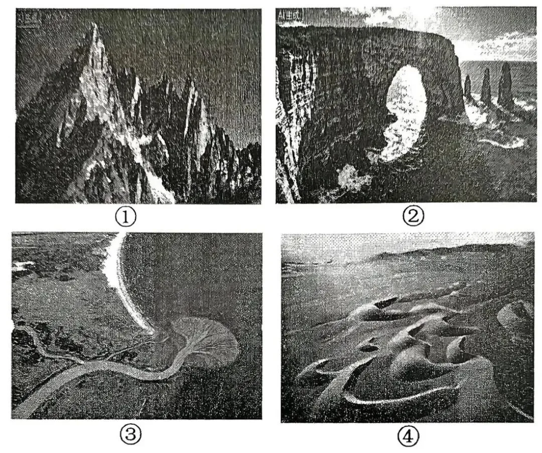 人工智能(AI)广泛应用于场景生成,下图为某同学依托AI工具生成的四幅地貌景观图。据此完成下面小题。