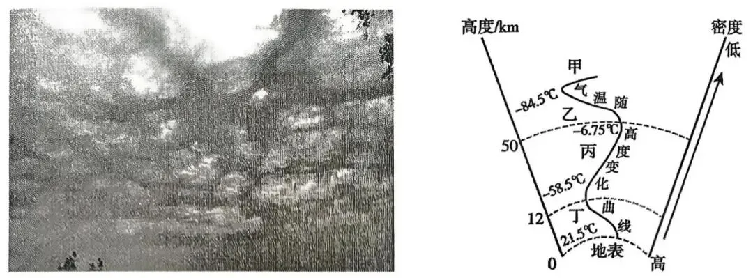 2025年6月19日,大连出现“窟窿云”奇观(左图),迅速刷爆朋友圈。气象专家表示这是层积云逐渐向积雨云演变的自然现象,而积雨云可能会引发雷暴、冰雹等强对流天气。右图示意大气的垂直分层。据此完成下面小题。