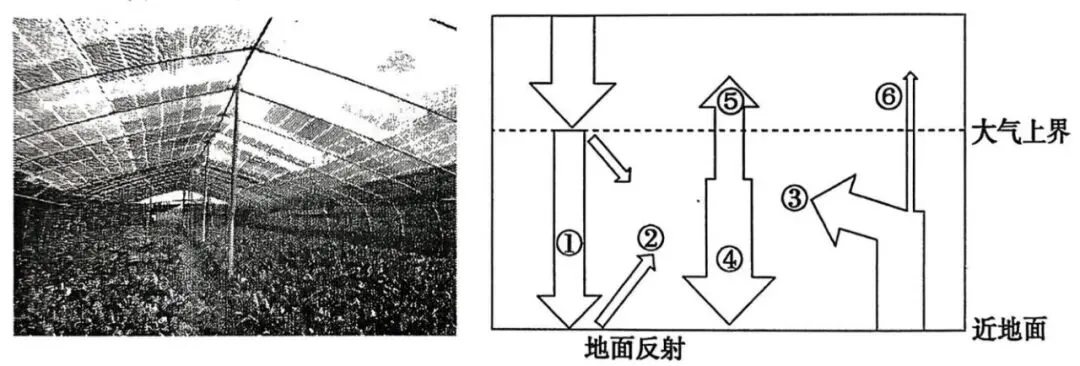 左图为我国北方某个蔬菜大棚照片,棚顶为夏季农民铺设的黑色尼龙网。右图为大气受热过程图。据此完成下面小题。