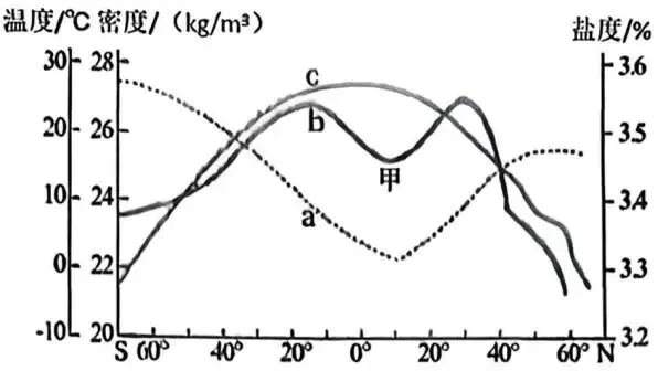 2024年8月,某科考船沿大西洋20°W经线完成了一次跨纬度海洋环境综合考察。下图为科考队员绘制的海水温度、盐度和密度随纬度变化的曲线图。据此完成下面小题。