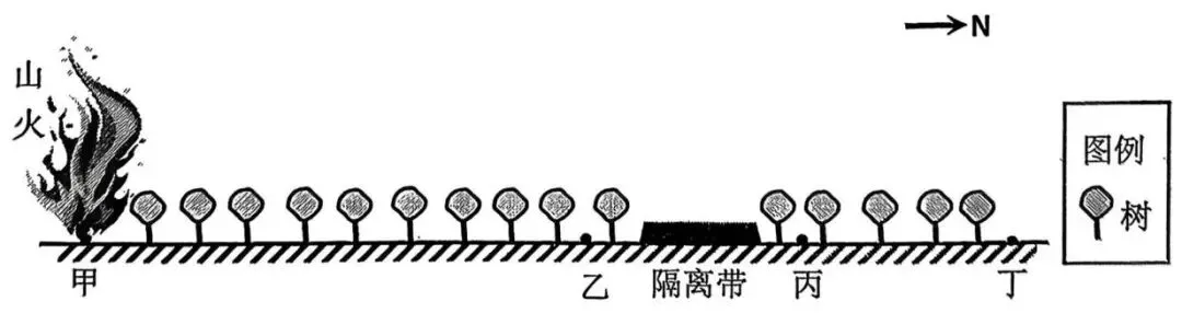 原理:甲地山火导致近地面空气受热上升,形成低气压;丁地气温较低,近地面形成高气压,近地面气流从丁地流向甲地(3 分)。在乙地倒火,倒火产生的火焰会顺着由丁指向甲的气流向甲地蔓延(2 分),与甲地山火相遇后,两地之间的可燃物被燃烧殆尽,山火因缺乏燃料而自然熄灭(1 分)。