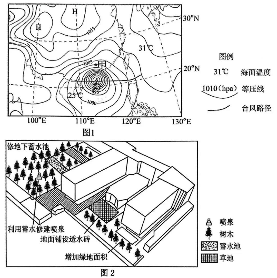 2025年9月24日17时,超强台风“桦加沙”在广东阳江市登陆。珠三角地区出现暴雨,多地出现严重内涝。图1为9月24日8时我国部分地区海平面等压线分布示意图。广东省珠海某中学原来校园路面硬化率高,校内无集中绿地,台风来临或雨季会积水严重。为了落实“海绵城市”的建设方针,该中学进行了“海绵校园”美化改造工程,如图2所示。