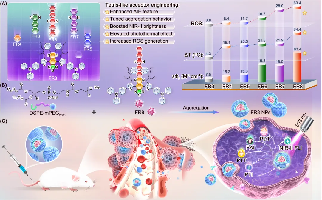 恶性肿瘤已成为日益加剧的全球健康危机,发病率和死亡率的不断上升给全球带来了巨大的医疗和社会经济负担。近年来,一体化光诊疗技术因其能够同步整合多模态光学成像与治疗功能引起了广泛的研究热情。其中,荧光成像(FLI)、光声成像(PAI)和光热成像(PTI)模式并存,并具有协同的光动力治疗(PDT)和光热治疗(PTT)功能的光诊疗剂的开发尤受重视。此外,发光波长在近红外二区(NIR-II, 1000–1700 nm)的光诊疗剂相对于近红外一区(NIR-I, 700–900 nm)和可见光(400–700 nm)的诊疗剂可获得更深的组织穿透力和更高的成像时空分辨率。然而,受制于能隙定律、聚集导致猝灭(ACQ)效应和复杂的激发态能量耗散途径调节等桎梏,性能优异的一体化光诊疗剂的开发仍任重而道远。具有聚集诱导发光(aggregation-induced emission, AIE)特性的发光材料可以很好的解决传统ACQ材料在生理环境中成像能力变弱的缺陷,而且,AIE材料还表现出显著的聚集增强诊疗(AET)特征。经过近些年的发展,AIE特性的NIR-II光诊疗剂已获得长足的发展,然而,它们的分子构筑模式仍局限于对经典给体、受体和π-桥的修饰,极大地限制了结构的多样化和性能的进一步突破。因此,同时从分子层面和聚集态行为两个维度调控AIE特性的NIR-II光诊疗剂的性能对拓展材料广度和肿瘤的高效一体化诊疗具有重要的研究意义。