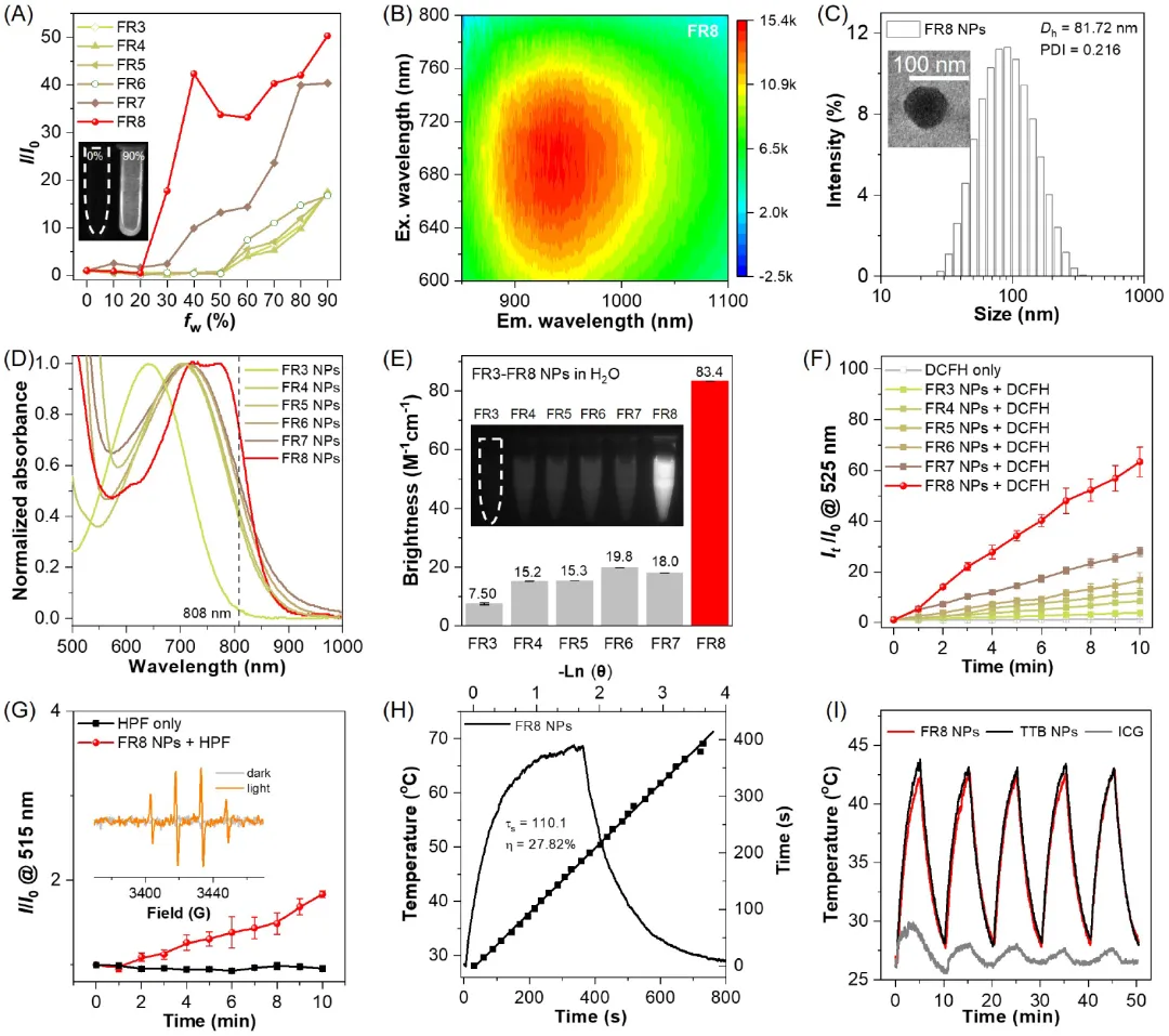 图2. 类俄罗斯方块受体工程构筑的一体化光诊疗剂的光物理性能。(A)所研究分子的AIE曲线; (B)光致发光-激发图; (C) FR8纳米粒子的DLS粒径分布图; (D)所研究纳米粒子在水相中的吸收光谱; (E)纳米粒子的亮度汇总; (F)总活性氧生成能力; (G)羟基自由基分型; (H) FR8纳米粒子的光热转换效率及(I)光热稳定性。
