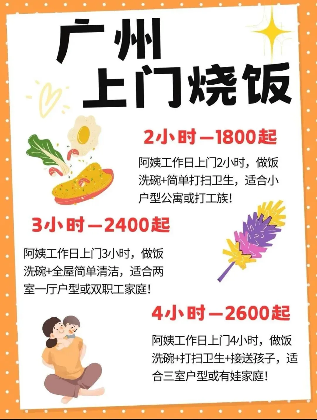 —2️⃣小时服务:简单快捷,做饭洗碗+简单打扫卫生,适合小户型公寓或打工族!✨。 3️⃣小时服务:做饭洗碗+全屋简单清洁,适合两室一厅户型或双职工家庭! 4️⃣小时服务:做饭洗碗+打扫卫生+接送孩子,适合三室户型或有娃家庭! 广州全区皆可安排阿姨上门哦,需要阿姨🉑添加以下二维码备注来意,或联系13458630569