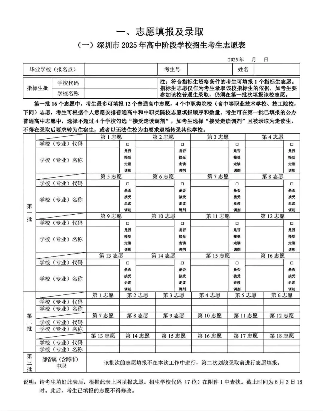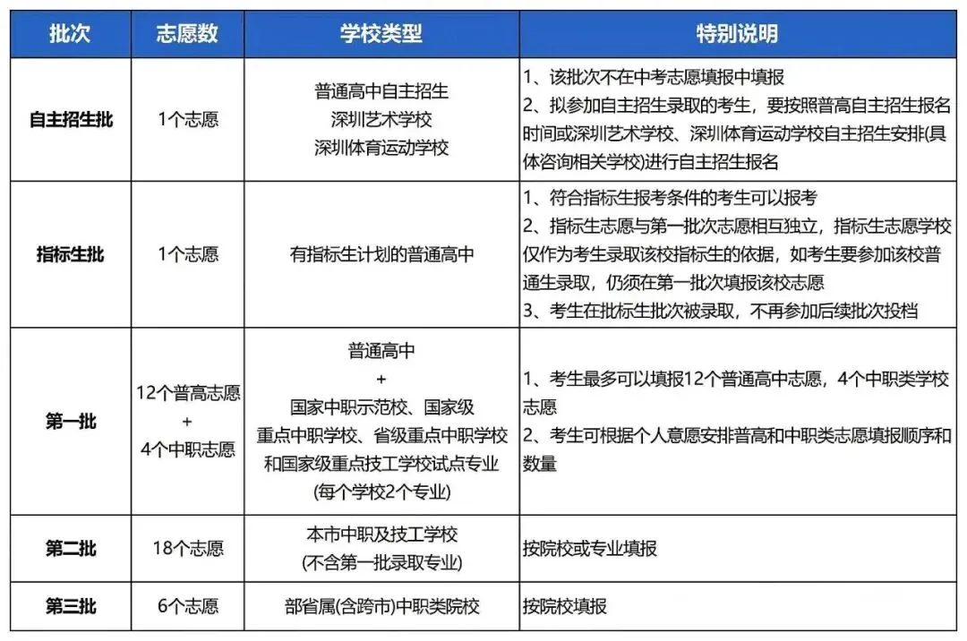 2025年深圳中考志愿填报共设5个批次,中考录取优先级为:自主招生批>指标生批>第一批次>第二批次>第三批次。