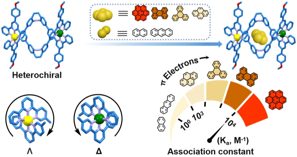 π-π 堆积驱动封装:π 电子数依赖的分子识别。金属有机螺旋 S 的方形腔体能够通过 π-π 堆积作用封装多环芳烃分子,且结合常数 (Kₐ) 与 PAHs 的 π 电子数呈线性正相关。