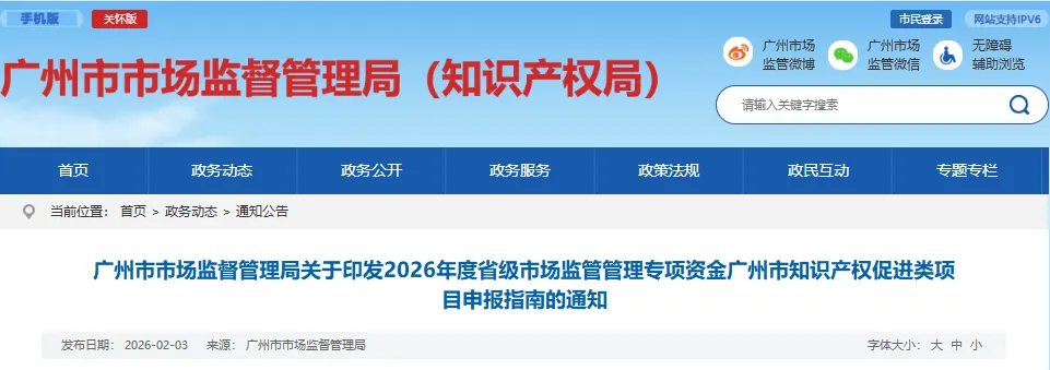 为做好2026年度省级市场监管管理专项资金广州市知识产权促进类项目申报工作,充分发挥财政资金引导作用,根据《广东省财政厅 广东省市场监管局关于印发〈广东省市场监督管理局(知识产权局)经管省财政专项资金管理办法(2024年修订)〉的通知》(粤财工〔2024〕2号)和《广州市知识产权工作专项资金管理办法》(穗知规字〔2023〕1号)有关要求,我局制定了2026年度省级市场监管管理专项资金广州市知识产权促进类项目申报指南和项目申报书。现印发给你们,请结合本单位工作需要,积极开展项目申报工作。