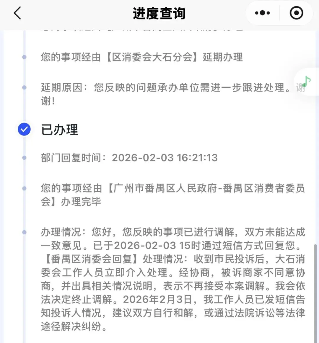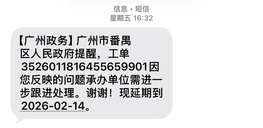1月30日,收到广州12345短信,说需要承办单位进一步处理,延期到2月14日。