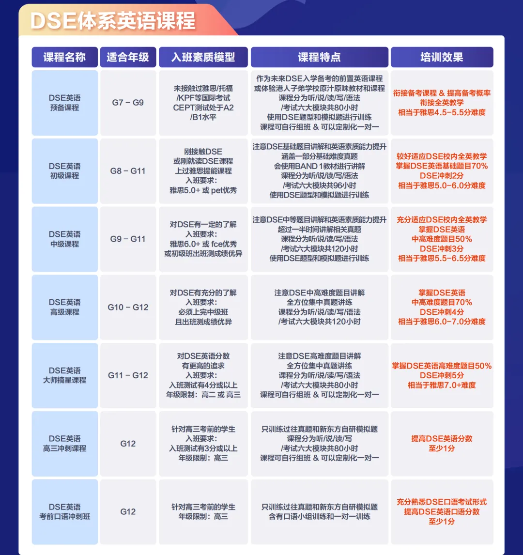 所以不管是想让孩子去香港插班、备考港人子弟学校、应对港人子弟学校分班考,还是普高之后学习DSE课程,DSE英语都是必须要提前规划学习的!