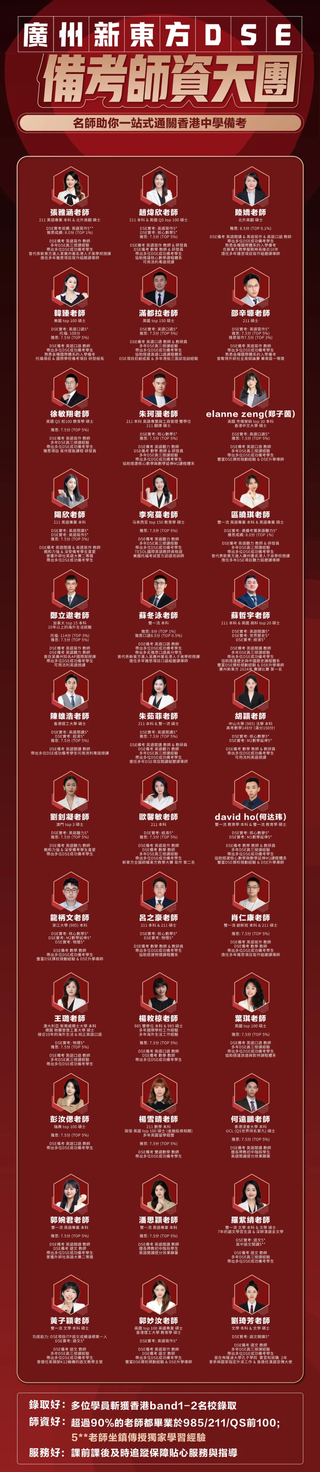 广州新东方DSE汇聚了超过数百位资深教师,每一位教师不仅具备丰富的教学经验,更在其专业领域内积累了深厚的学术造诣。广州新东方DSE教学团队以专业的知识体系和对教育事业的无限热忱,全心致力于为学员打造最高品质的学习体验!与传统培训机构不同,广州新东方DSE不仅注重理论知识的传授,更强调实践能力的培养,确保每一位学员都能在实际应用中游刃有余。我们定期组织高水平的教研会议,深入探讨教学中的热点、难点及疑问,通过持续不断的优化与创新,显著提升了教师团队的专业素养和教学技艺。打铁还需自身硬,超过70%的老师毕业于985/211/ 世界排名前100高校,DSE教学团队的老师不仅自生优秀出身名校,更专注实际教学所需,多位一线教师参与DSE实考夺得5**成绩,并传授对应学科科目。每一位学科老师都以严谨的教学态度、生动的教学方式,点燃学员的学习热情;他们以精准的教学策略,引领学员避开备考误区,直击DSE知识要点;他们用专业的教学力量,让学员掌握高效解题技巧,全面提升应试能力,为孩子追逐梦校的道路打下坚实基础!我们坚信“教育不是填满一桶水,而是点燃一把火”。因此,我们始终坚持小班化、精品化的教学原则,严格控制班级人数规模,确保每位学员都能成为课堂的主角,获得教师的充分关注与个性化指导。相比传统的大班教学,我们的小班化、精品化教学模式具有显著的优势。减少教师关注盲点,确保每位学员都能获得老师的充分关注。课堂上,精准把握学员动态,促进互动交流;课后,个性化指导助力学员成长。配套安排的辅导课除了学管老师和助教以外,也会有正课老师进行跟盯,监督学员完成作业并给予适当点拨,给足孩子课外答疑时间,避免出现下课后孩子有问题不知如何解决的情况。除了保障学生可以更好地吸收当天/当周的知识以外,也能促进产生良好的师生关系,从各个层面营造出良好的学习环境。个性化学习路径:根据每位学员的特点和需求,调整教学内容和进度,确保学习过程既有趣又有效。及时反馈与调整:通过每日更新的学习报告,家长和学生可以随时掌握学习进展,教学团队也能快速响应并适时调整教学方法。互动交流平台:通过专门的沟通群组,搭建一个师生、家长之间的高效沟通桥梁,促进信息共享和问题解决。广州新东方DSE凭借其卓越的教学质量和丰富的教学成果,赢得了广大学员及其家长的高度认可与一致好评!目前,广州新东方DSE寒假、春季课程报名已火热启动!雅思/DSE课程等你来报!