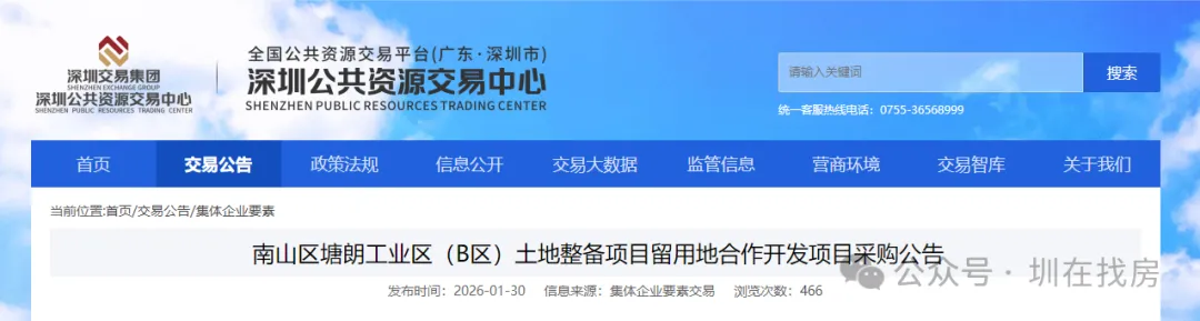 2月2日,深圳公共资源交易中心关于南山区塘朗工业区(B区)土地整备项目留用地合作开发项目采购公告。