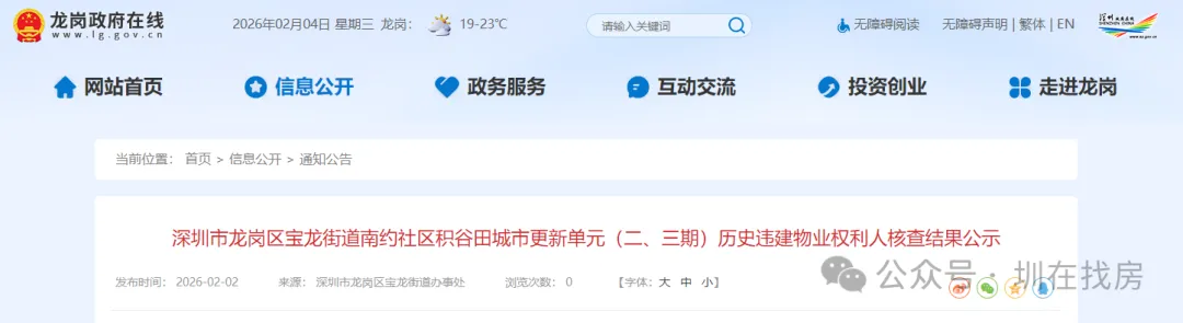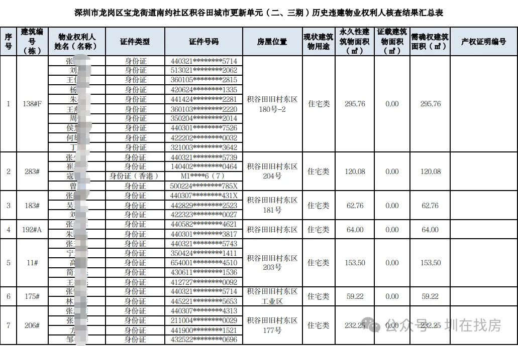 深圳市龙岗区宝龙街道办事处关于龙岗区宝龙街道南约社区积谷田城市更新单元(二、三期)历史违建物业权利人核查结果公示。